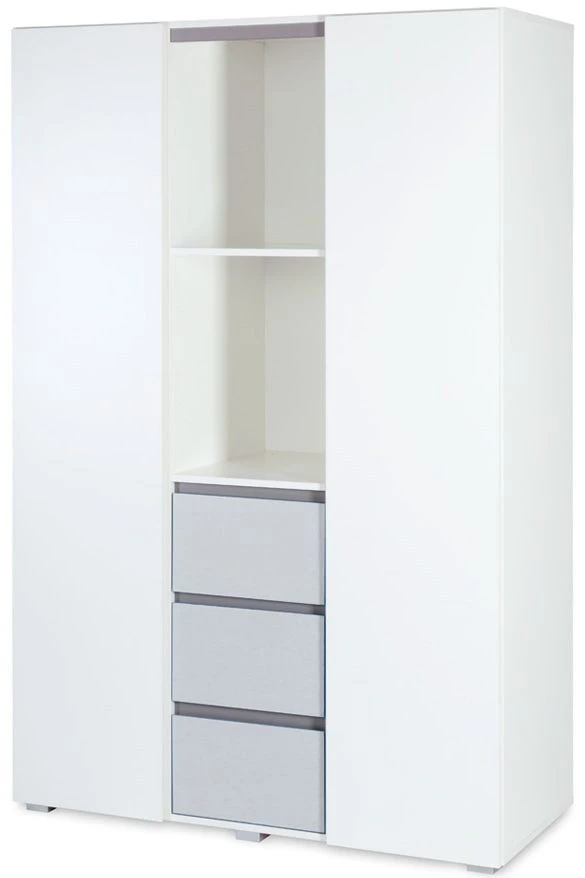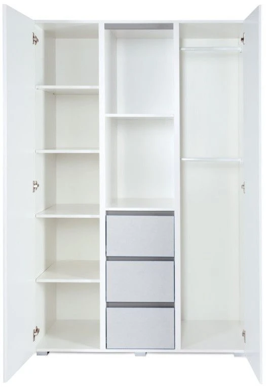 De moderne kast Jasmijn biedt lekker veel opbergruimte voor jou en je kleintje. Achter de rechterdeur hangen twee roedes met de mogelijkheid om kleertjes op te hangen. Achter de linkerdeur bevinden zich maar liefst 5 open vakken om spulletjes in op te bergen. Verder bevat het middendeel nog twee open vakken en drie lades op extra stevige ladegeleiders. De kast is gemaakt van degelijk en stevig plaatmateriaal in mooie witte en grijze tinten.