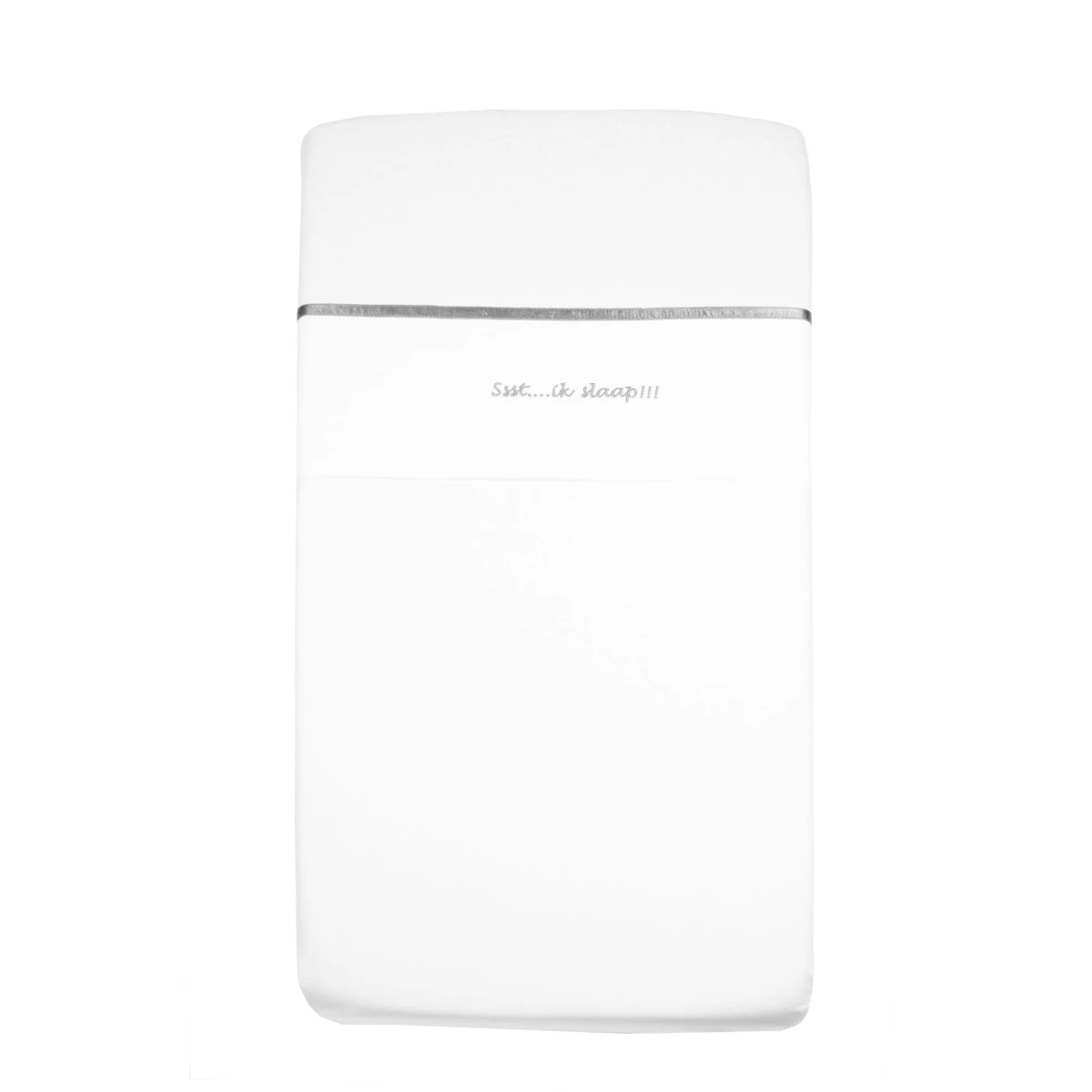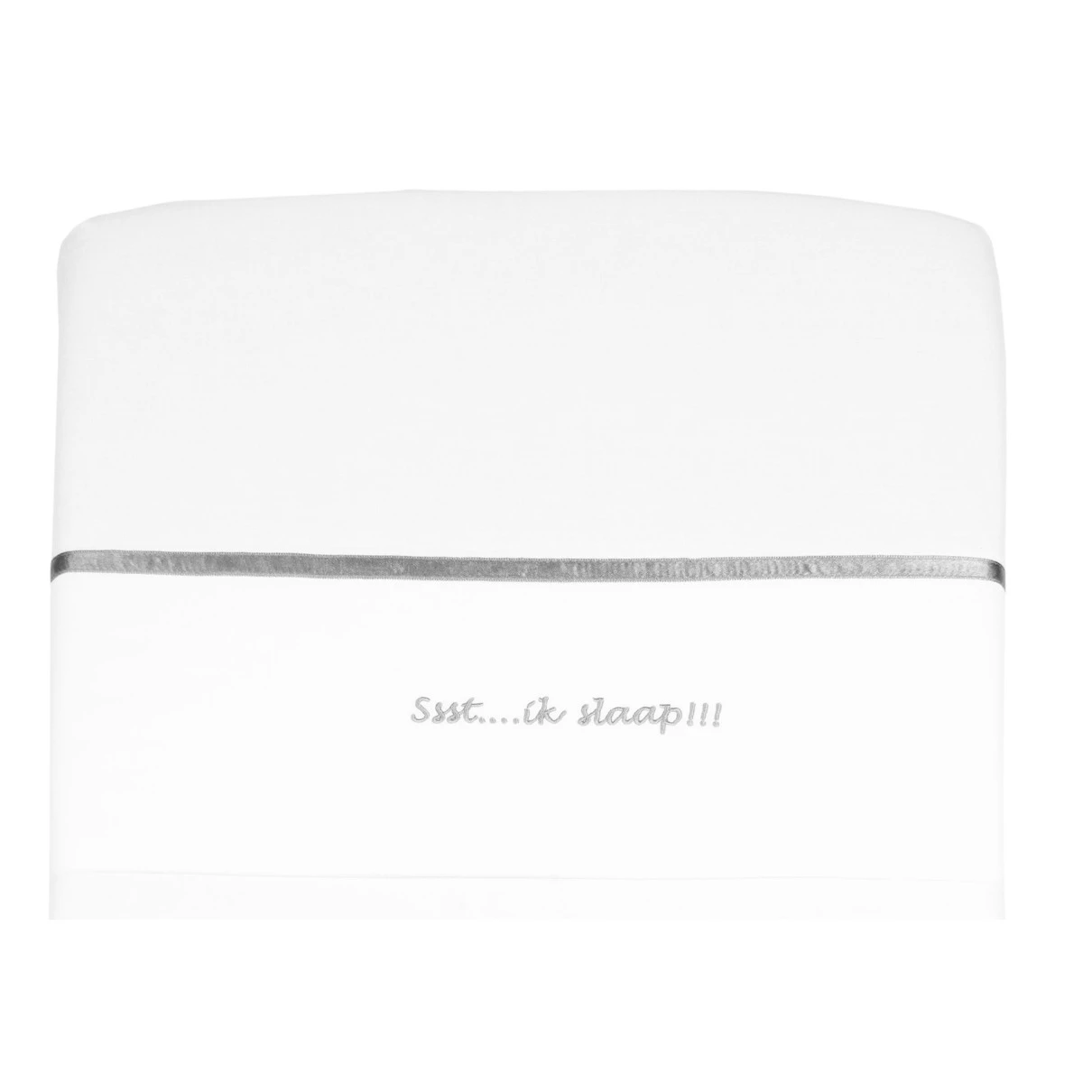 Je kleintje komt helemaal tot rust zodra hij/zij onder dit prachtige wieglakentje van Briljant ligt. Dit lakentje is volledig wit van kleur met grijskleurige bies aan de bovenkant en de geborduurde tekst ‘Sttt… Ik Slaap!’ wat het lakentje leuk afmaakt!