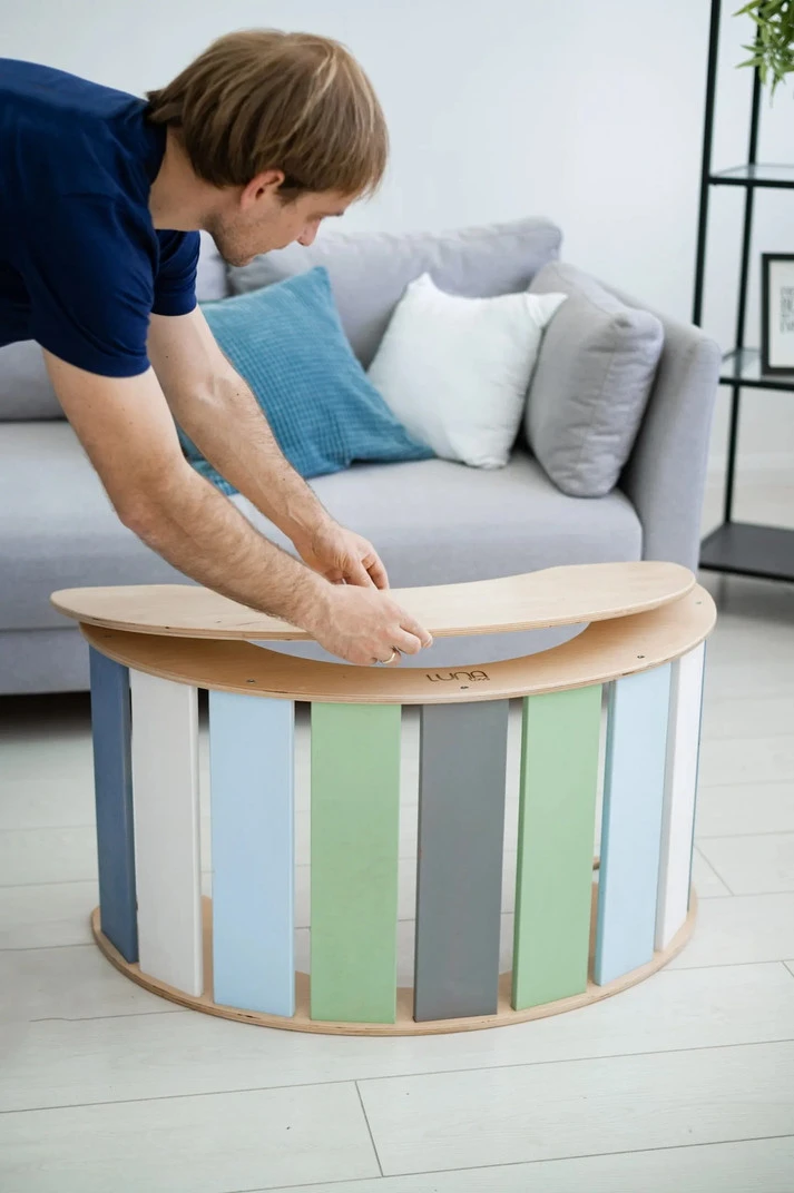 Het tafelblad is gemaakt van stevig berkenhout en is zeer eenvoudig te monteren op de schommelstoel dankzij de groeven aan de onderzijde.
