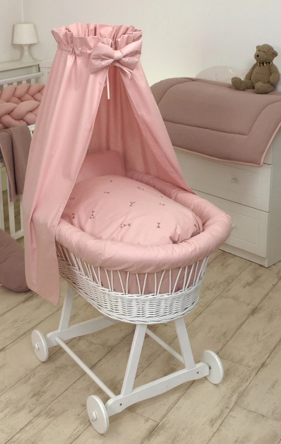 Dit schitterende Deluxe wiegje van MamaLoes is met de hand gemaakt en heeft een mooie, roze bekleding uit de Pure collectie. De rotan mand is wit van kleur en heeft een stevig, houten onderstel. De sluier, die standaard met deze wieg meegeleverd wordt, is helemaal in de stijl van de wiegbekleding en zorgt er dan ook voor dat dit wiegje helemaal af is!